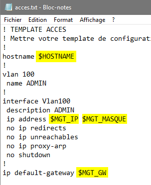 - Un ou plusieurs template de configuration (format txt): modèle(s) de configuration. Les éléments variables (hostname, adresses IP, etc.) commencent par le symbole $.