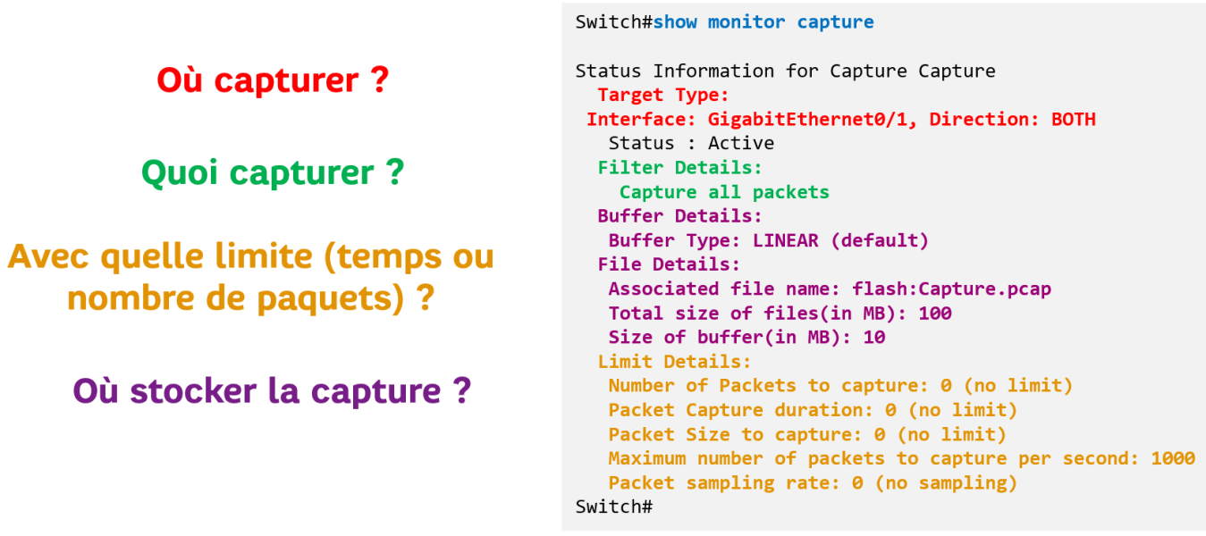 La capture se configure en utilisant la commande monitor capture sur le switch. Voici les options disponibles pour définir les paramètres de la capture:
